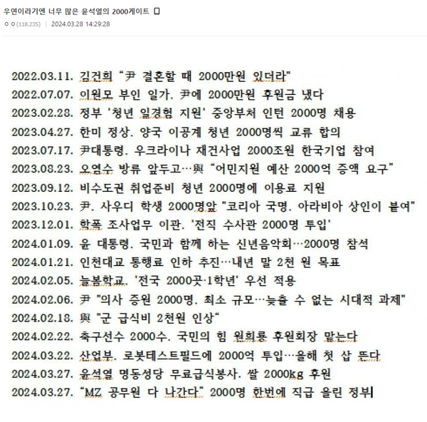 지난 26일부터 디씨인사이드, 에펨코리아 등 온라인 커뮤니티에는 '윤석열이 숫자 2000에 집착하는 이유', '무당의 숫자 2000', '이천공의 2000 샤머니즘' 등을 제목으로 한 게시물이 수십개씩 올라오고 있는 현상입니다. 역술인 천공의 본명인 '이천공'과 윤석열 정부 정책에 등장하는 '2000'이라는 숫자를 엮는 내용인데요.